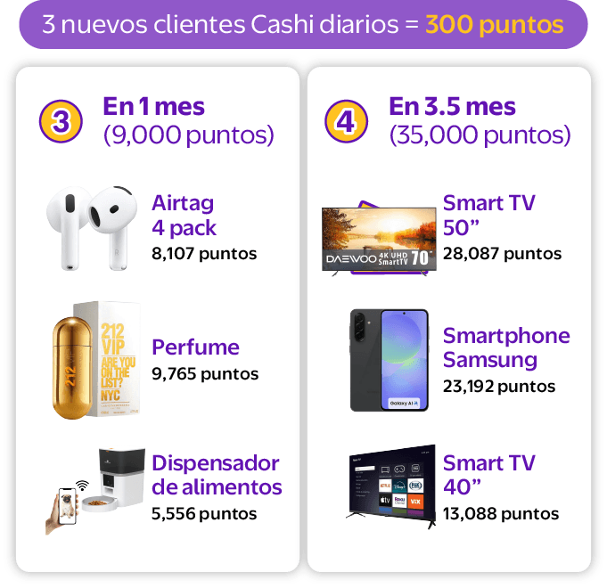 5 puntos por cada cliente que no tiene Cashi y lo des de alta desde POS con su número de celular o descargando la aplicación desde tú código QR.
